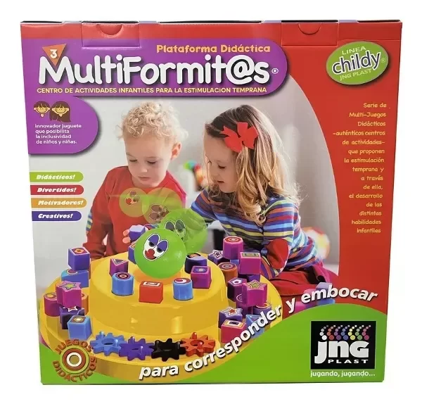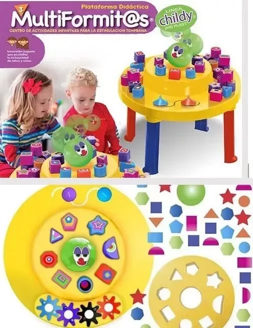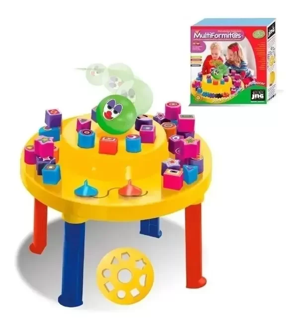 Juego Didáctico con formitas diferentes, que estimula la creatividad a medida que los chicos asocian, corresponden y embocan los bloquitos en los lugares correspondientes. Bloquecitos de ocho formatos diferentes y pelota, a insertar en la base con calados coincidentes para jugar sobre plataforma circular desarmable con móviles embutidos, que se deslizan manualmente.