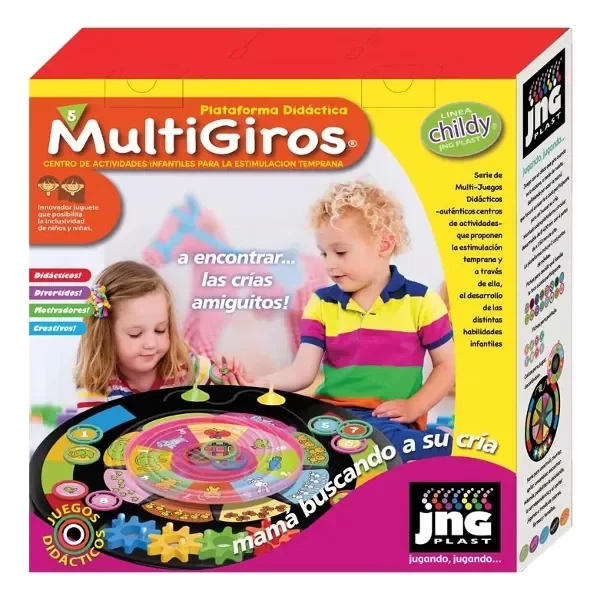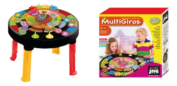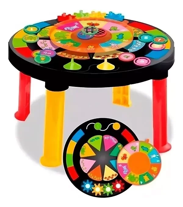 Incopora un disco que gira cuando se lo acciona. - 8 Fichas para puntaje y 8 fichas para determinar por azar a qué familia de animalitos le toca a cada participante. - Ideal para estimular la creatividad y el aprendizaje. - Juego compuesto por plataforma circular desarmable de 400 mm x 250 mm de alto con 4 patas encastrables. - Incluye 45 bloques geométricos multiformas y multicolores. - Incluye calcos para jugar decorándolos.